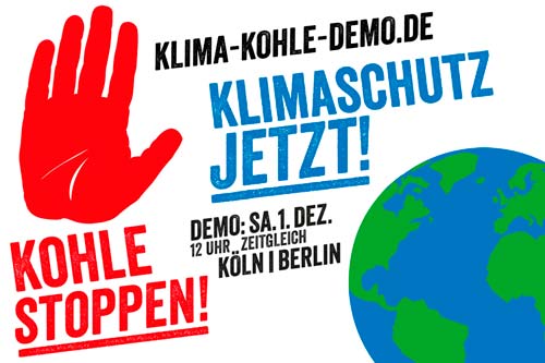 Das wollen und werden wir ändern. Zusammen mit vielen tausend Menschen. Am 1. Dezember in Köln, vor den Toren des größten Braunkohlereviers Europas, und in Berlin, vor der Haustür der Bundesregierung. Wir rufen all den Verzagten in der Bundesregierung und der Kohlekommission zu: Wir müssen die weitere Erderhitzung stoppen und dafür den sozialverträglichen Kohleausstieg schnell und kraftvoll beginnen!